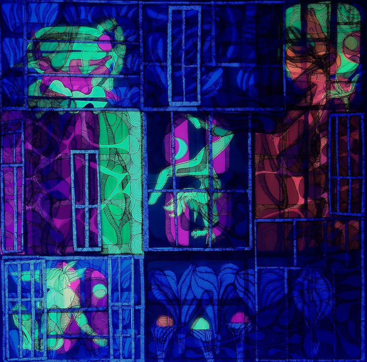 Obraz z serii „Snuwidzenia” to zaproszenie do świata snów i symboli między „Alicją w Krainie Czarów” Lewisa Carrolla, a „Czerwoną Księgą” Carla Gustava Junga. To podróż przez nieoczywiste ścieżki wyobraźni, pełne wizji i ukrytych znaczeń. Zastosowanie elementów świecących w świetle UV umożliwia oglądanie prac zarówno w świetle dziennym, jak i w nocy, co stanowi dodatkowy, unikatowy wymiar tych obrazów.