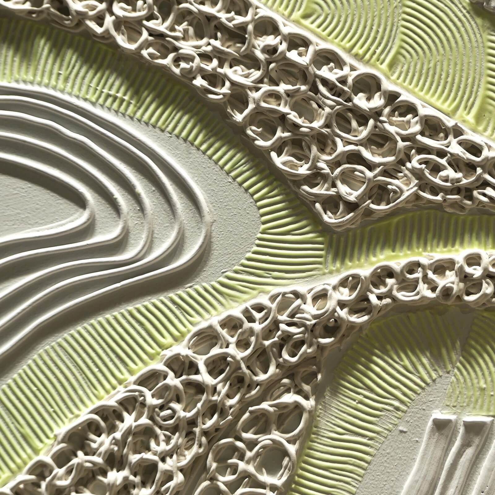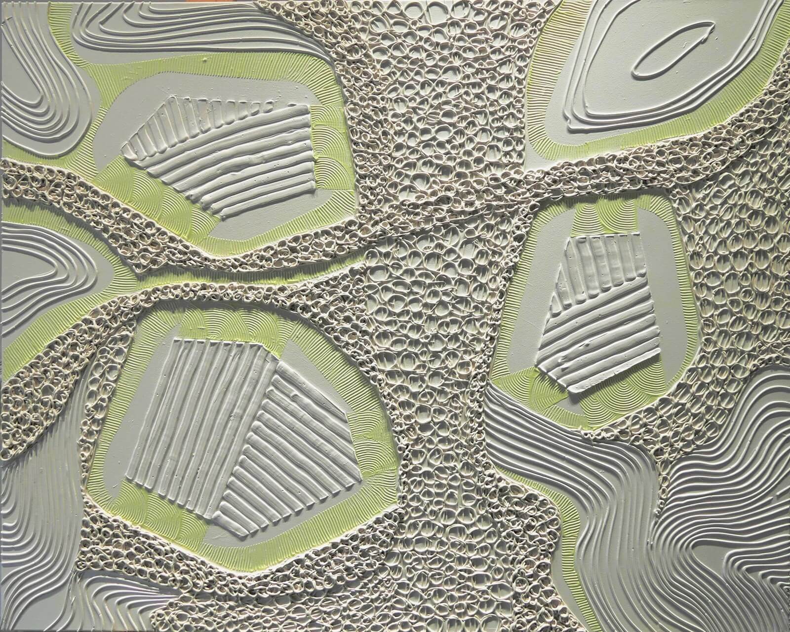Obraz z białej serii "Zaangażowane wycofanie" inspirowanej szeroko pojętą kulturą i sztuką Japonii. Zastosowanie farby świecącej w ciemności umożliwia oglądanie prac zarówno w świetle dziennym, jak i w nocy, co stanowi dodatkowy, unikatowy wymiar tych obrazów.