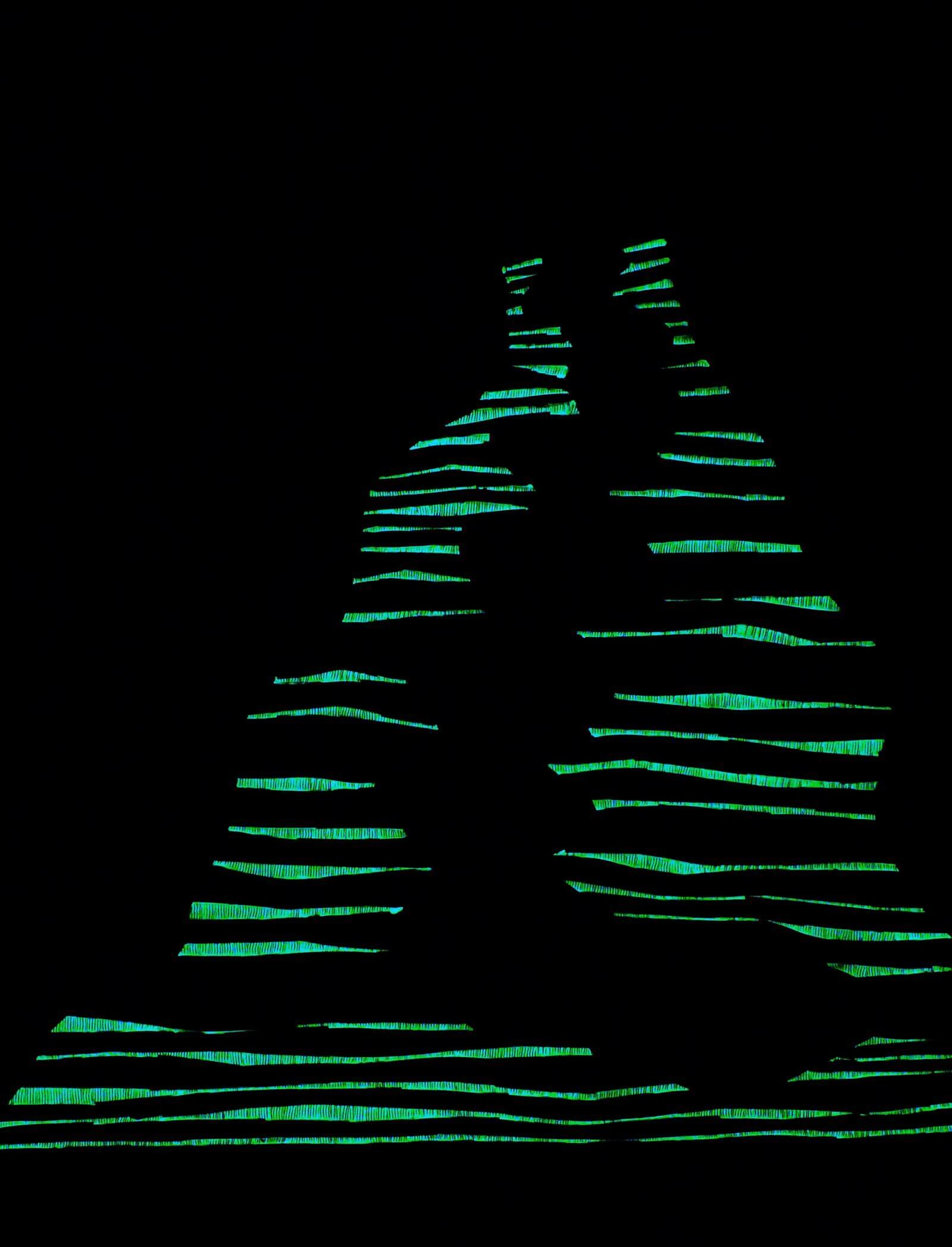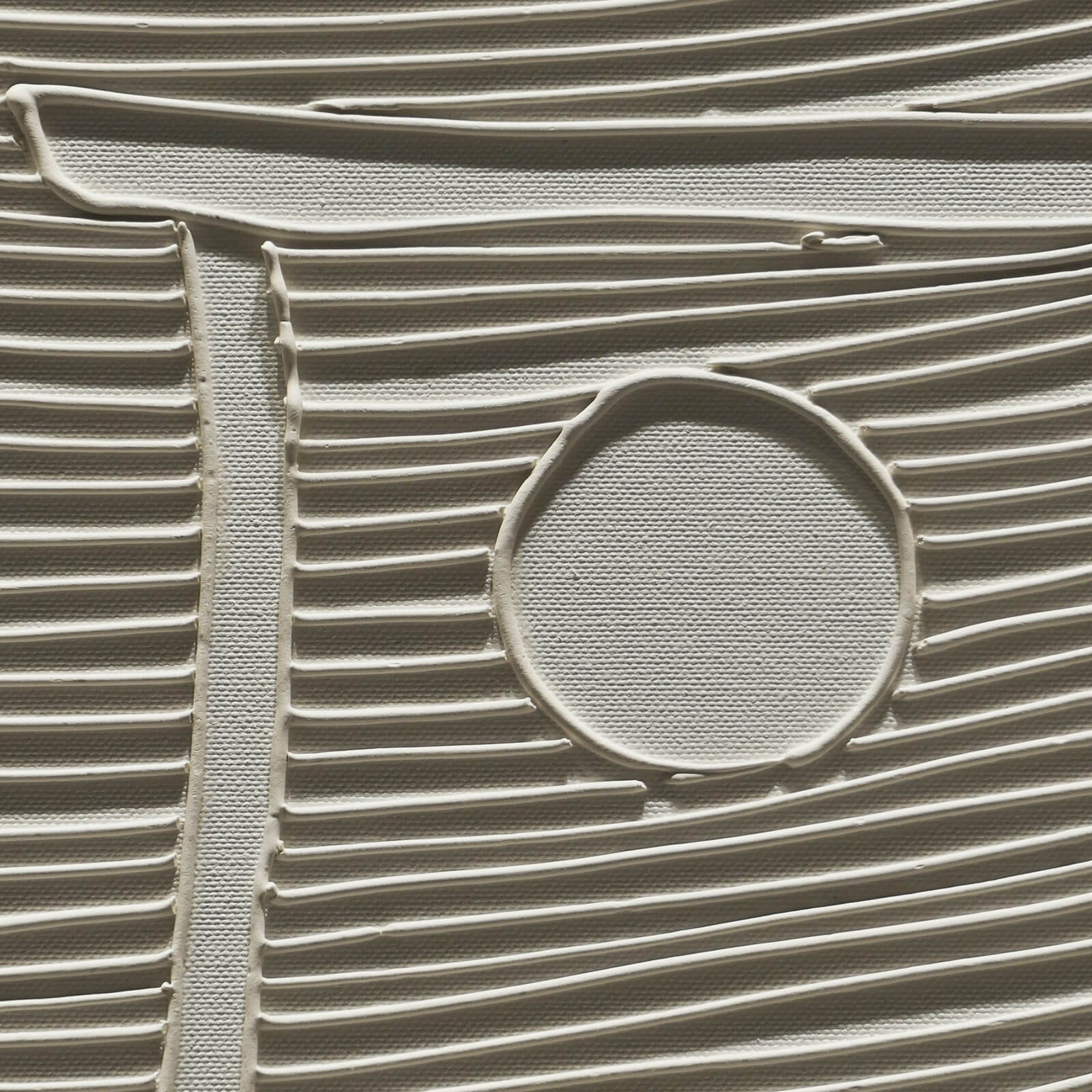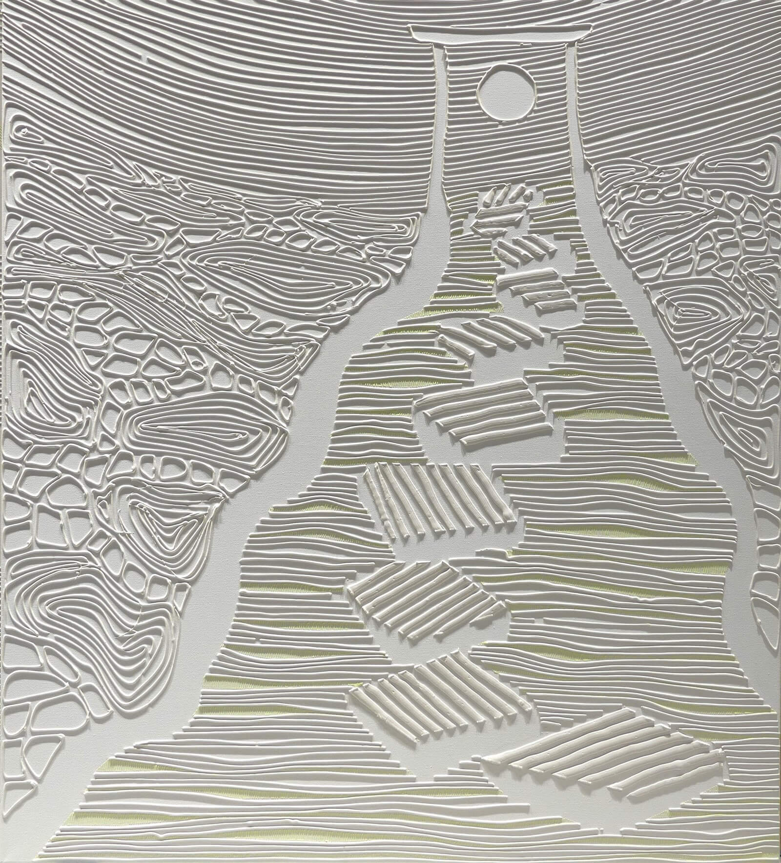Obraz z białej serii "Zaangażowane wycofanie" inspirowanej szeroko pojętą kulturą i sztuką Japonii. Zastosowanie farby świecącej w ciemności umożliwia oglądanie prac zarówno w świetle dziennym, jak i w nocy, co stanowi dodatkowy, unikatowy wymiar tych obrazów.
