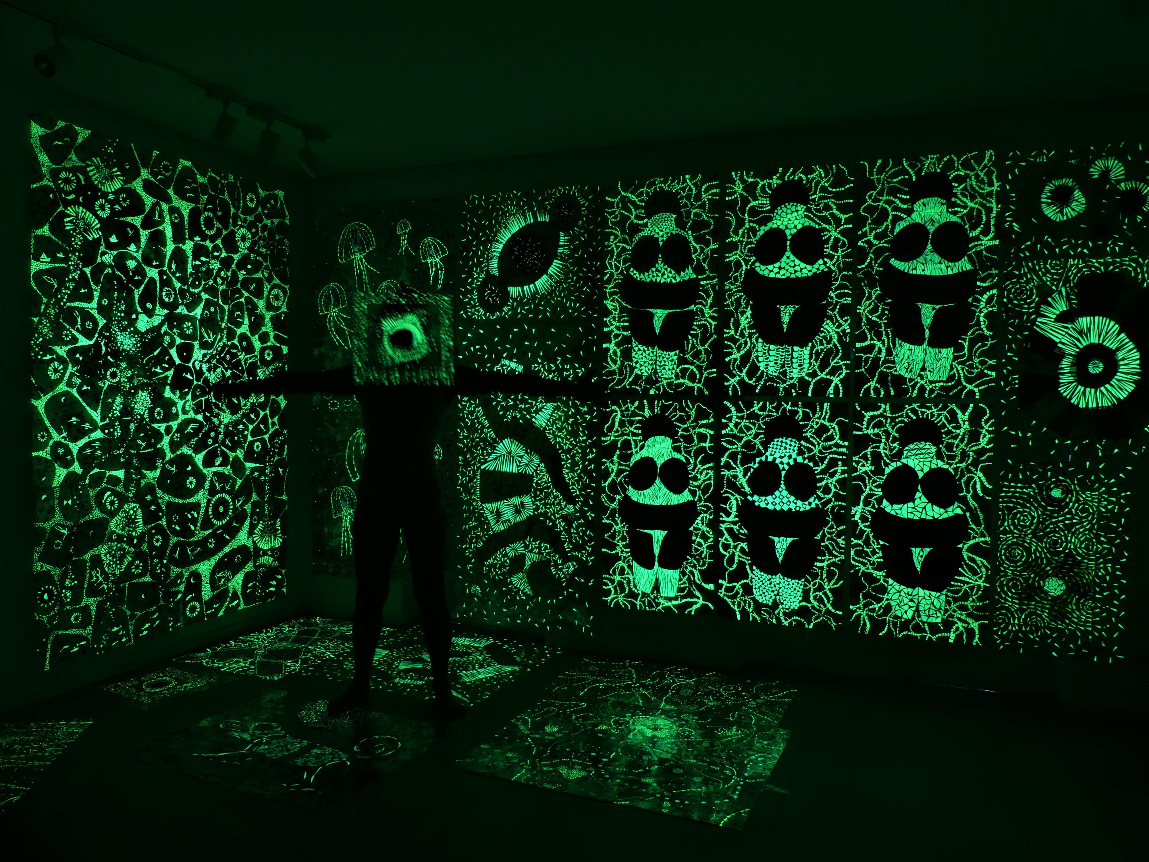 Paintings that transform in the dark - revealing hidden stories through glowing, fluorescent layers. Each piece is handcrafted using original techniques and acrylic forms.