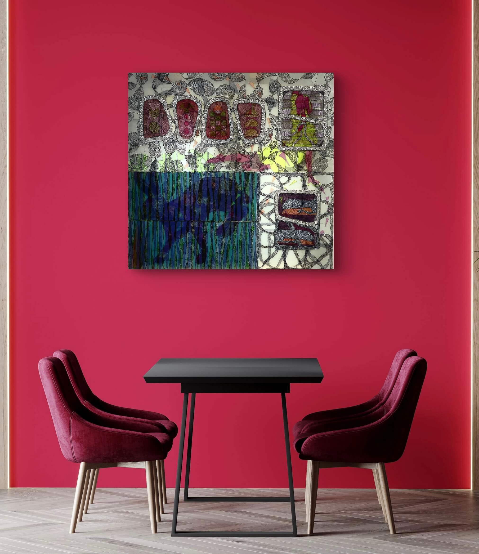 The painting from the “Dreamvisions” series is an invitation into a world of dreams and symbols — somewhere between Alice’s Adventures in Wonderland by Lewis Carroll and The Red Book by Carl Gustav Jung. It is a journey through the unexpected pathways of imagination, rich with visions and hidden meanings. The use of UV-reactive elements allows the works to be viewed both in daylight and in darkness, offering an additional, unique dimension to each piece.
