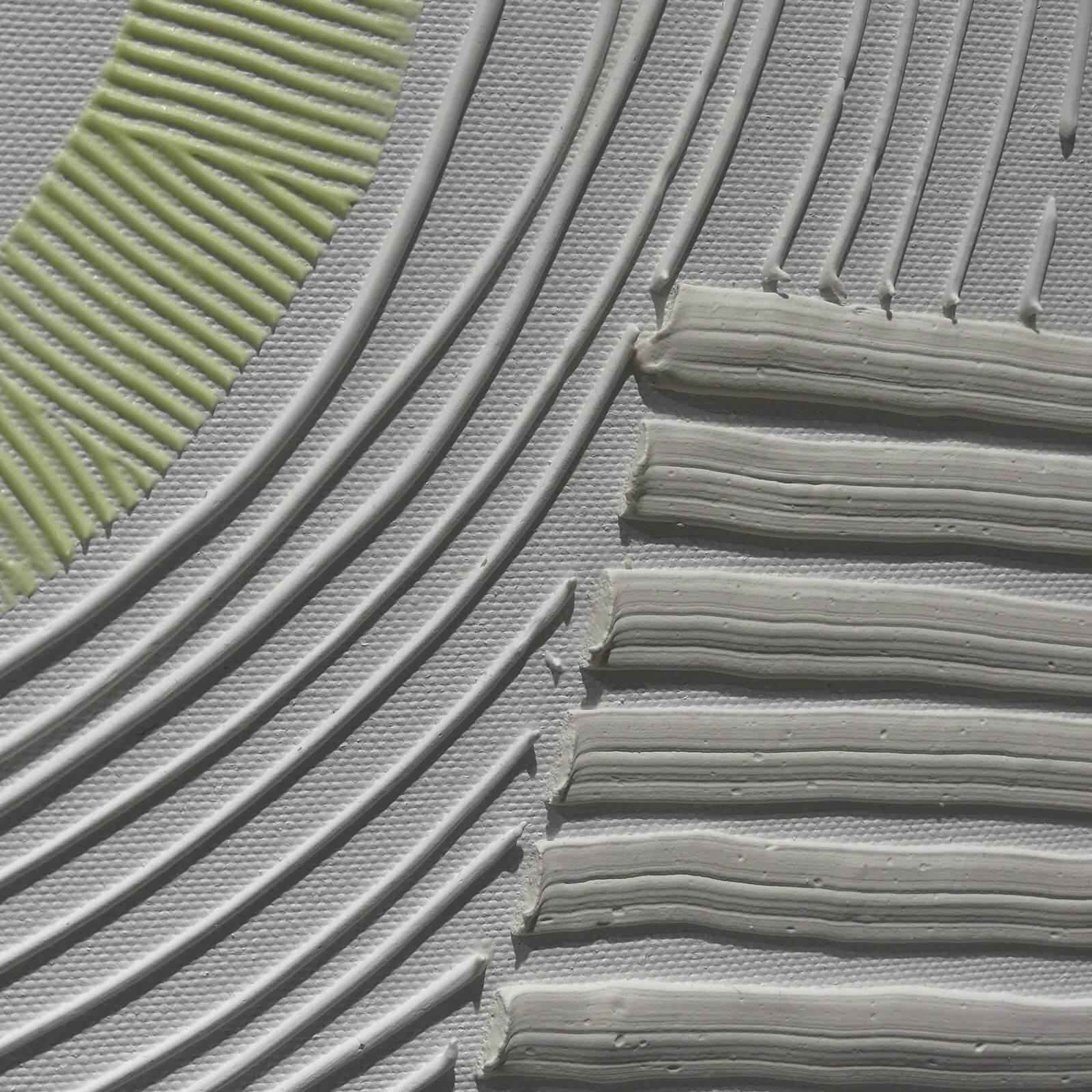 Obraz z białej serii "Zaangażowane wycofanie" inspirowanej szeroko pojętą kulturą i sztuką Japonii. Zastosowanie farby świecącej w ciemności umożliwia oglądanie prac zarówno w świetle dziennym, jak i w nocy, co stanowi dodatkowy, unikatowy wymiar tych obrazów.