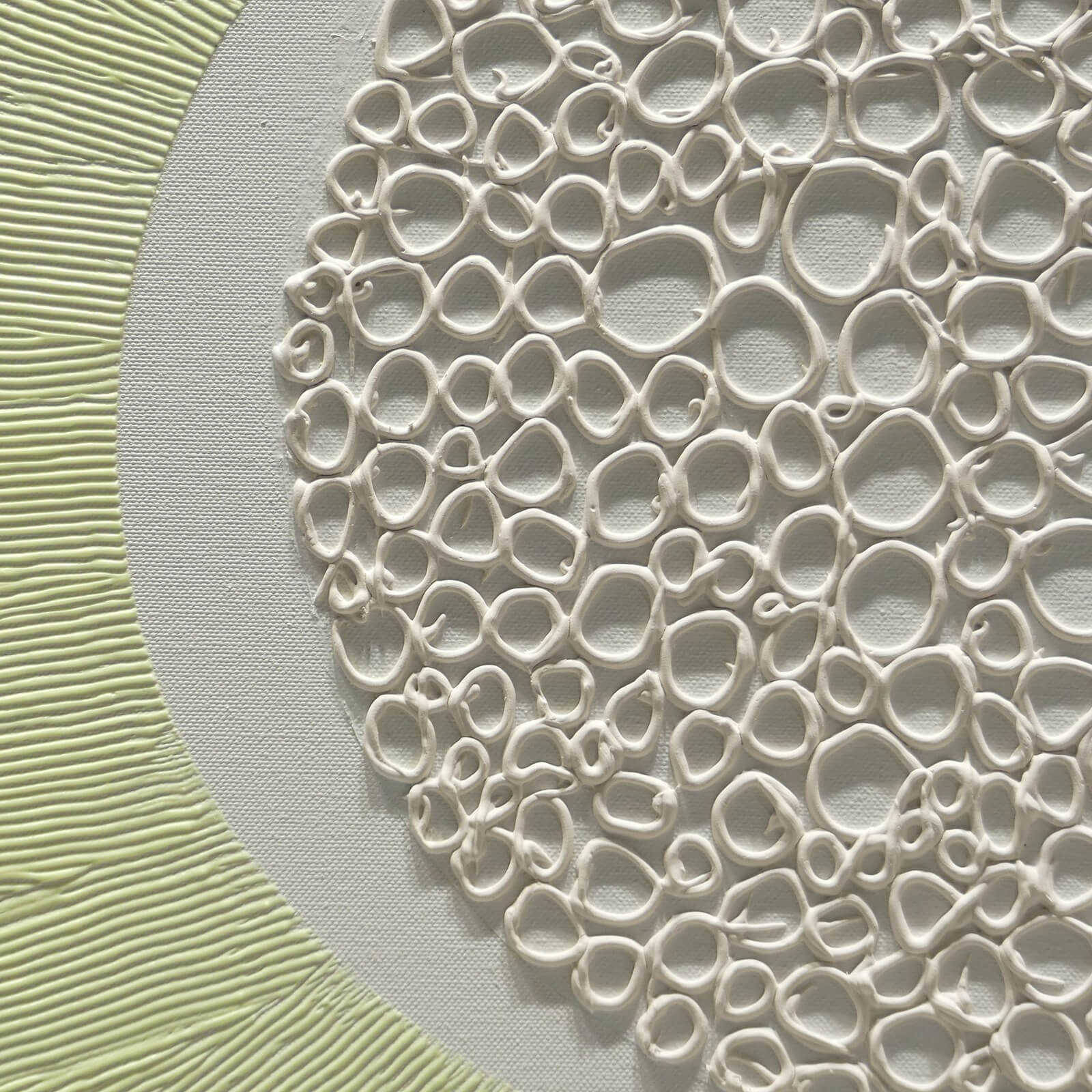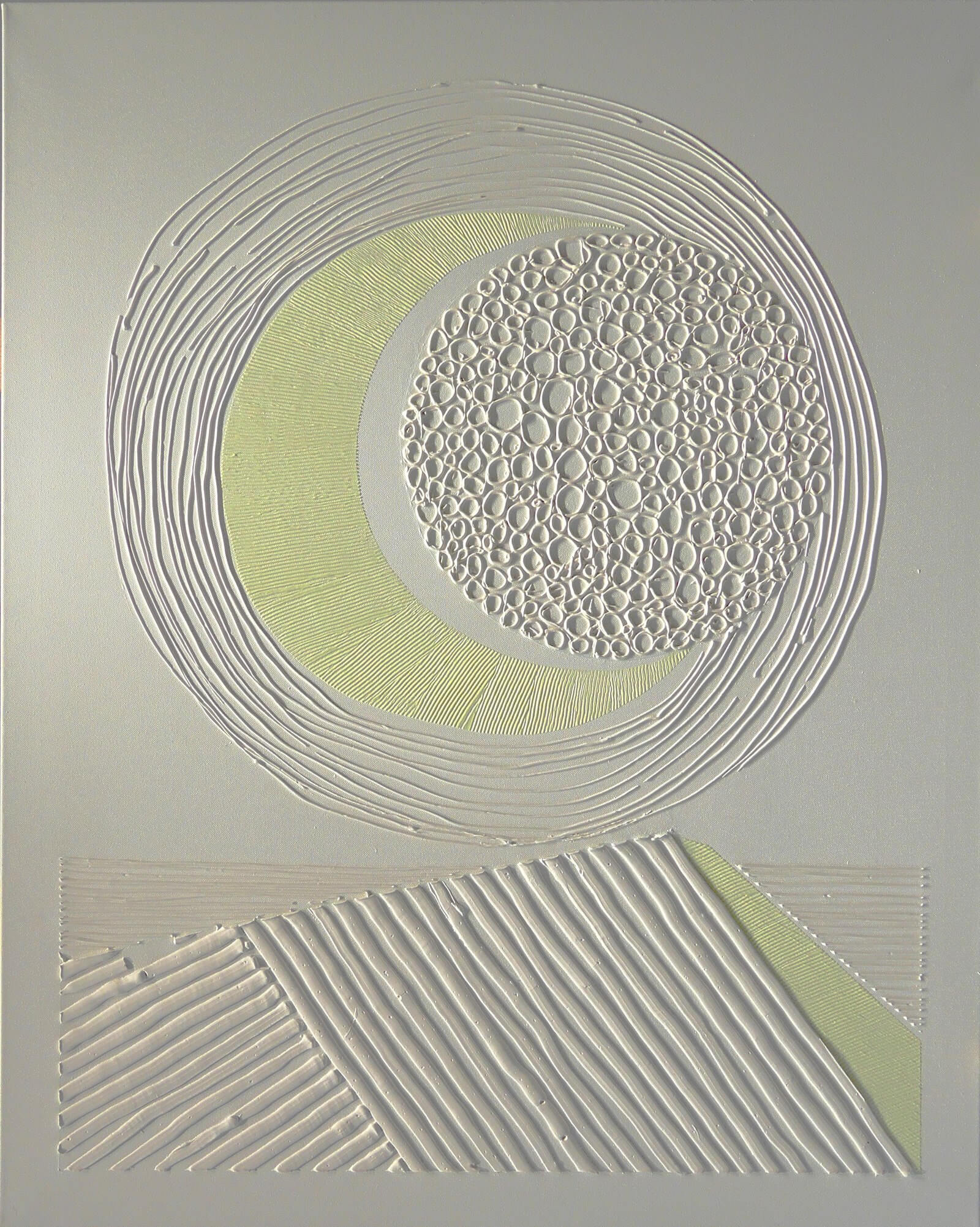 Obraz z białej serii "Zaangażowane wycofanie" inspirowanej szeroko pojętą kulturą i sztuką Japonii. Zastosowanie farby świecącej w ciemności umożliwia oglądanie prac zarówno w świetle dziennym, jak i w nocy, co stanowi dodatkowy, unikatowy wymiar tych obrazów.