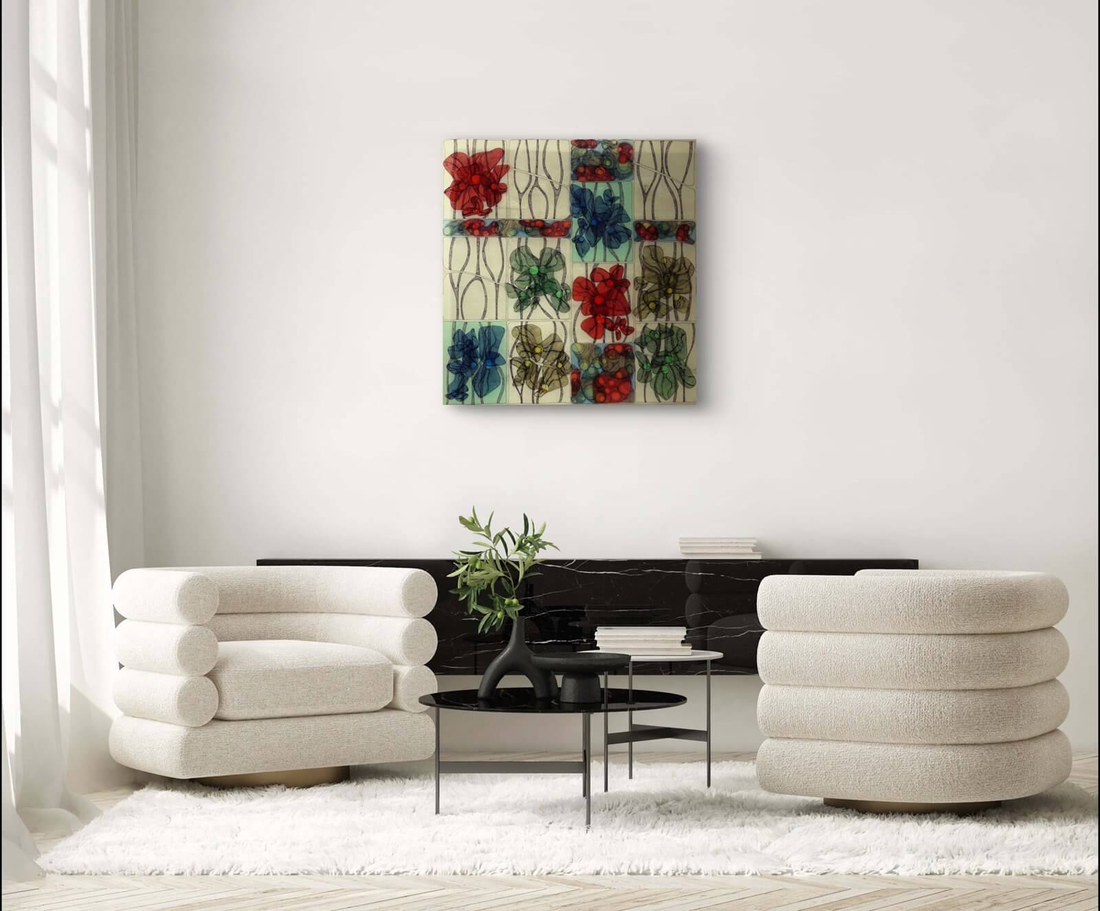 Obraz z serii "Ogrody" nawiązujący do ogrodu jako miejsca równowagi i więzi z naturą. Przestrzeń, w której sięgamy do korzeni, jednocześnie dążąc do wzrostu ku nowym możliwościom.