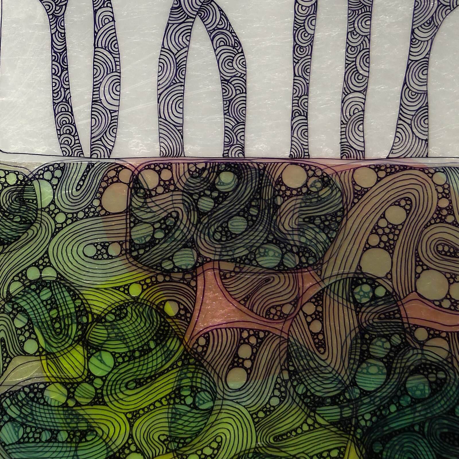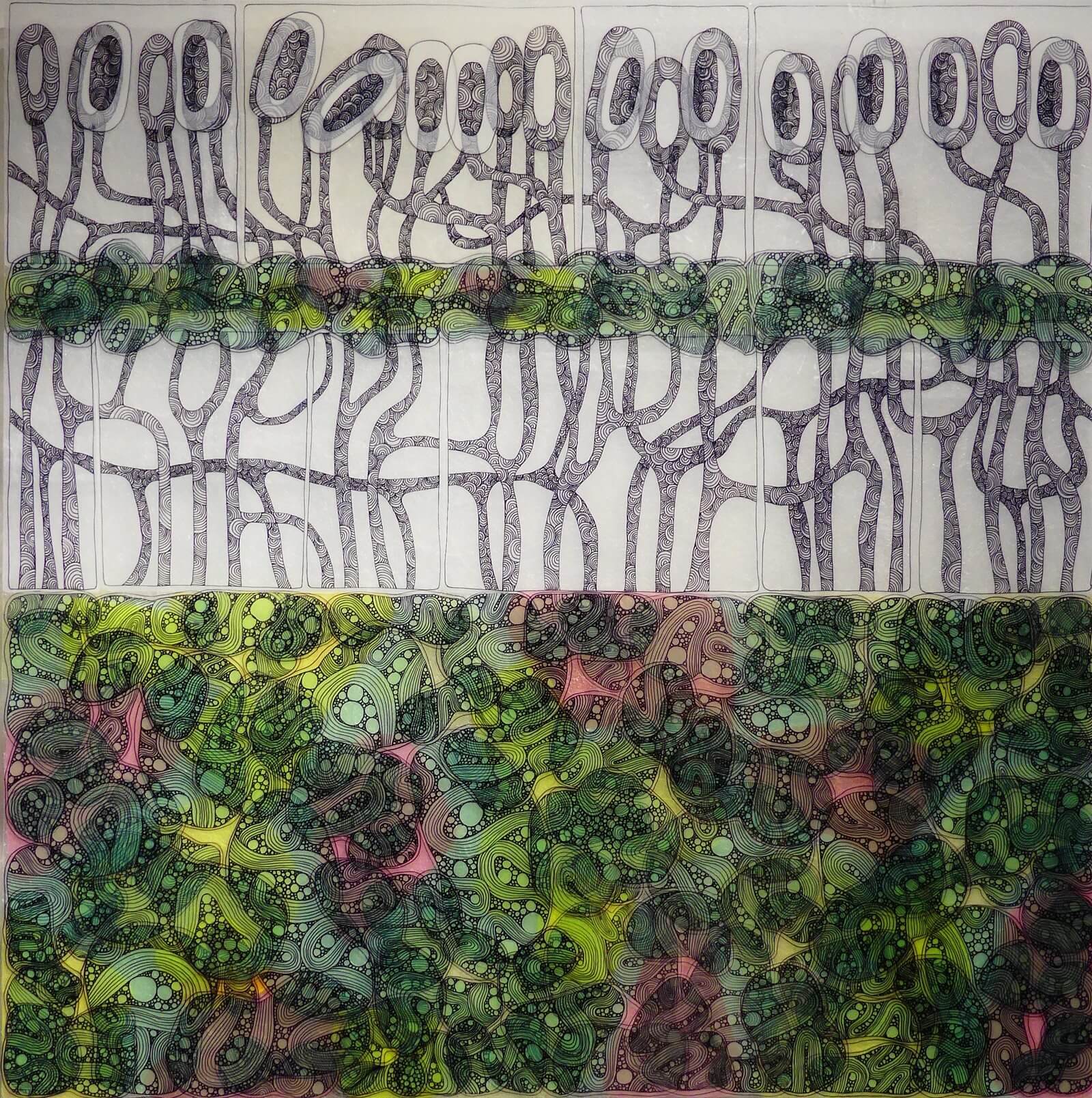 Obraz z serii "Ogrody" nawiązujący do ogrodu jako miejsca równowagi i więzi z naturą. Przestrzeń, w której sięgamy do korzeni, jednocześnie dążąc do wzrostu ku nowym możliwościom.