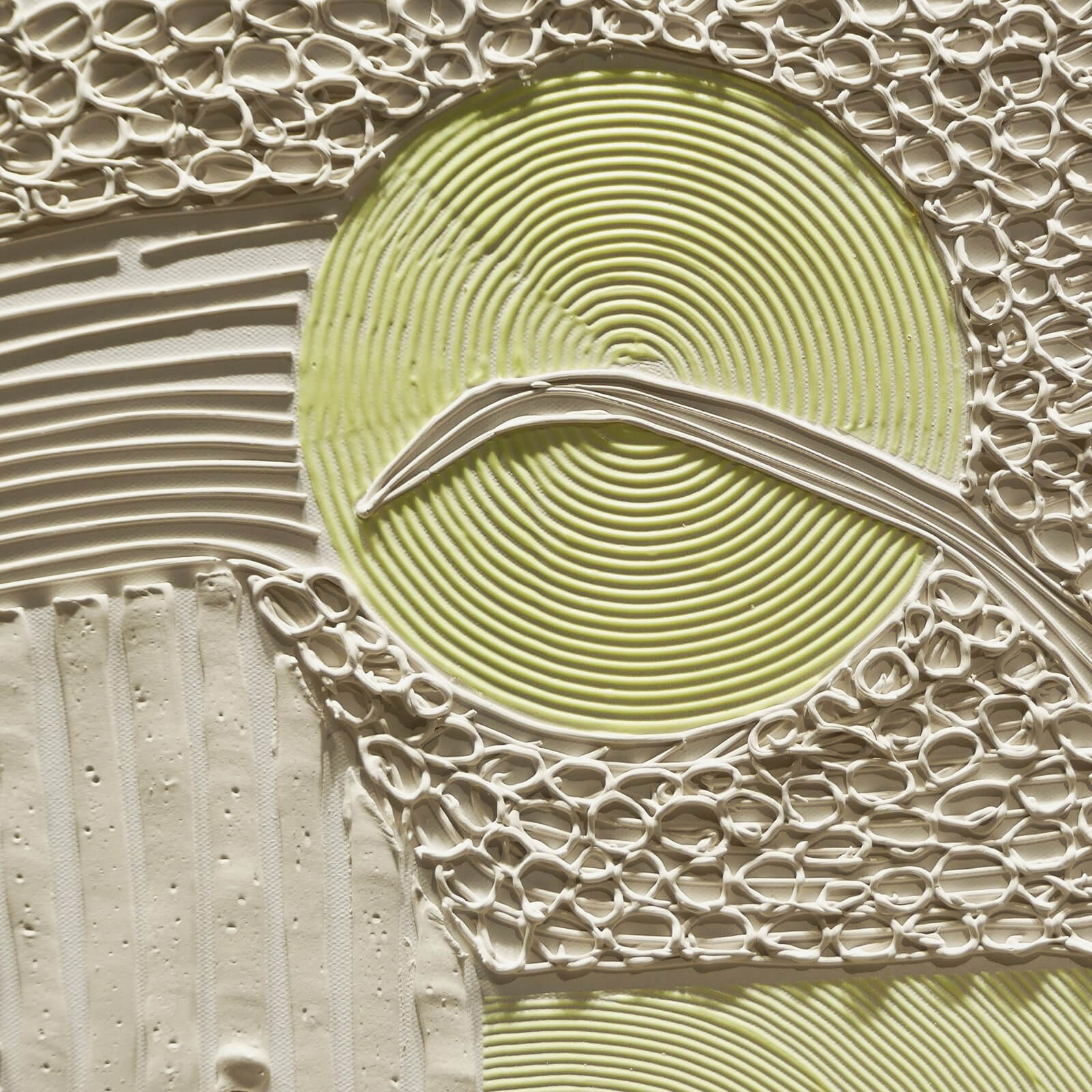 Obraz z białej serii "Zaangażowane wycofanie" inspirowanej szeroko pojętą kulturą i sztuką Japonii. Zastosowanie farby świecącej w ciemności umożliwia oglądanie prac zarówno w świetle dziennym, jak i w nocy, co stanowi dodatkowy, unikatowy wymiar tych obrazów.