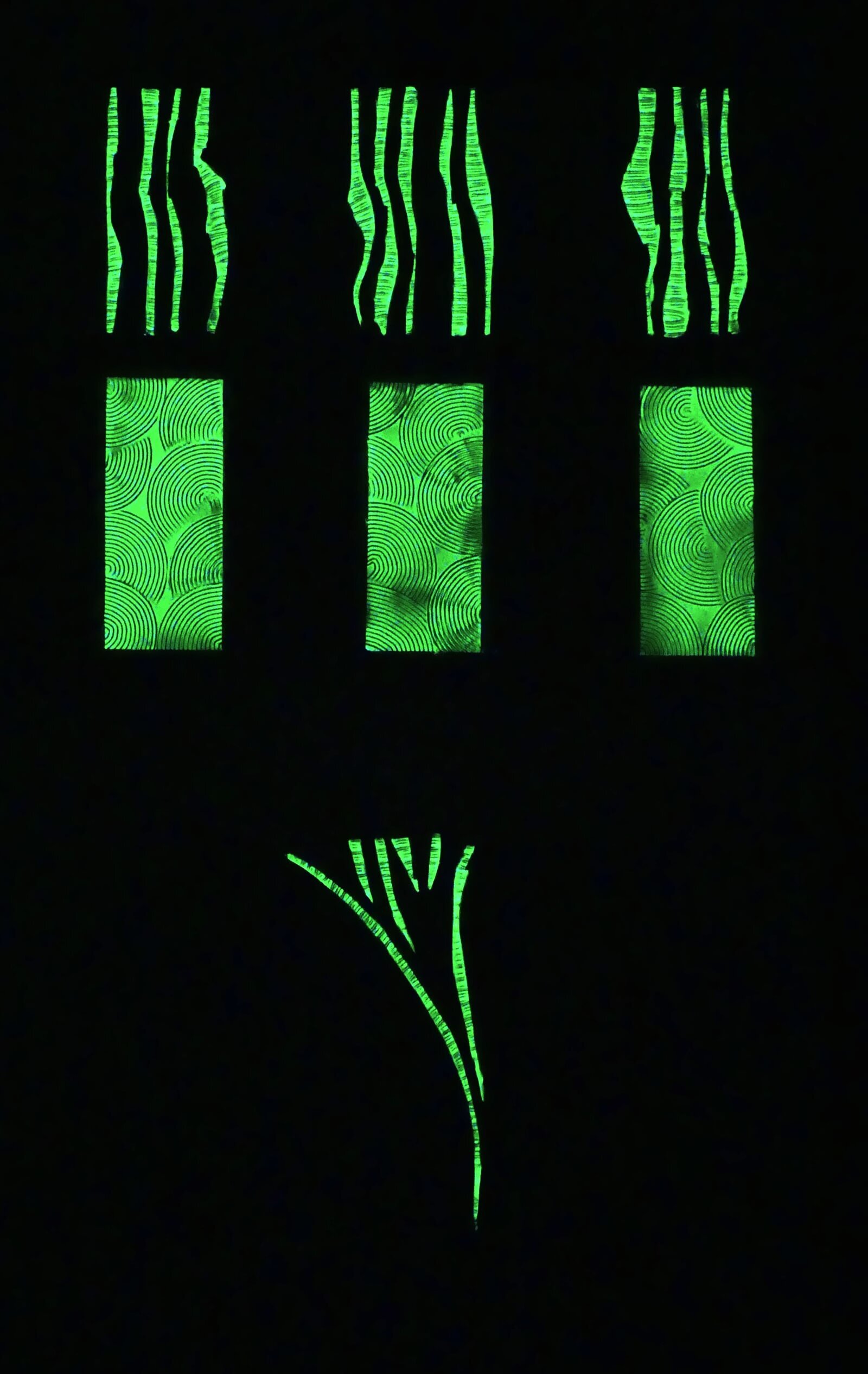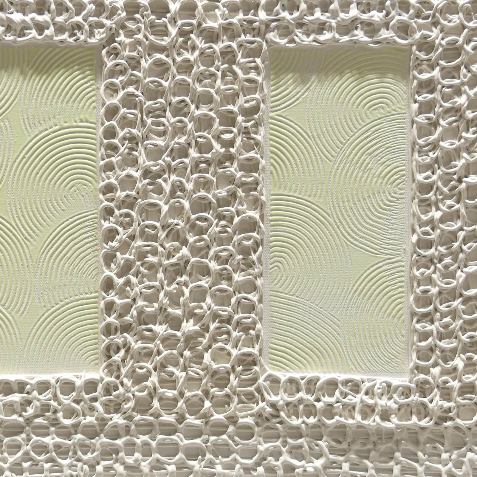 Obraz z białej serii "Zaangażowane wycofanie" inspirowanej szeroko pojętą kulturą i sztuką Japonii. Zastosowanie farby świecącej w ciemności umożliwia oglądanie prac zarówno w świetle dziennym, jak i w nocy, co stanowi dodatkowy, unikatowy wymiar tych obrazów.