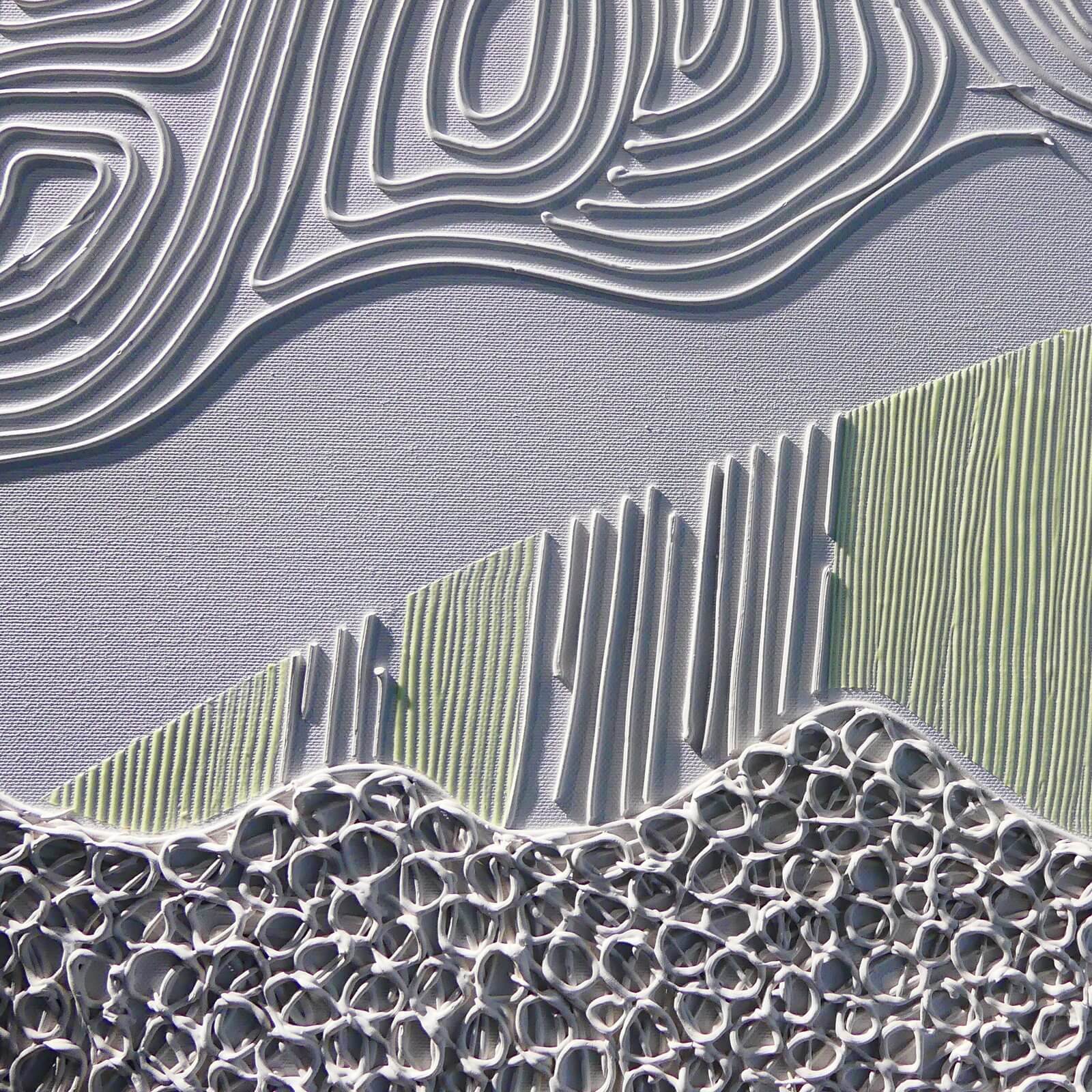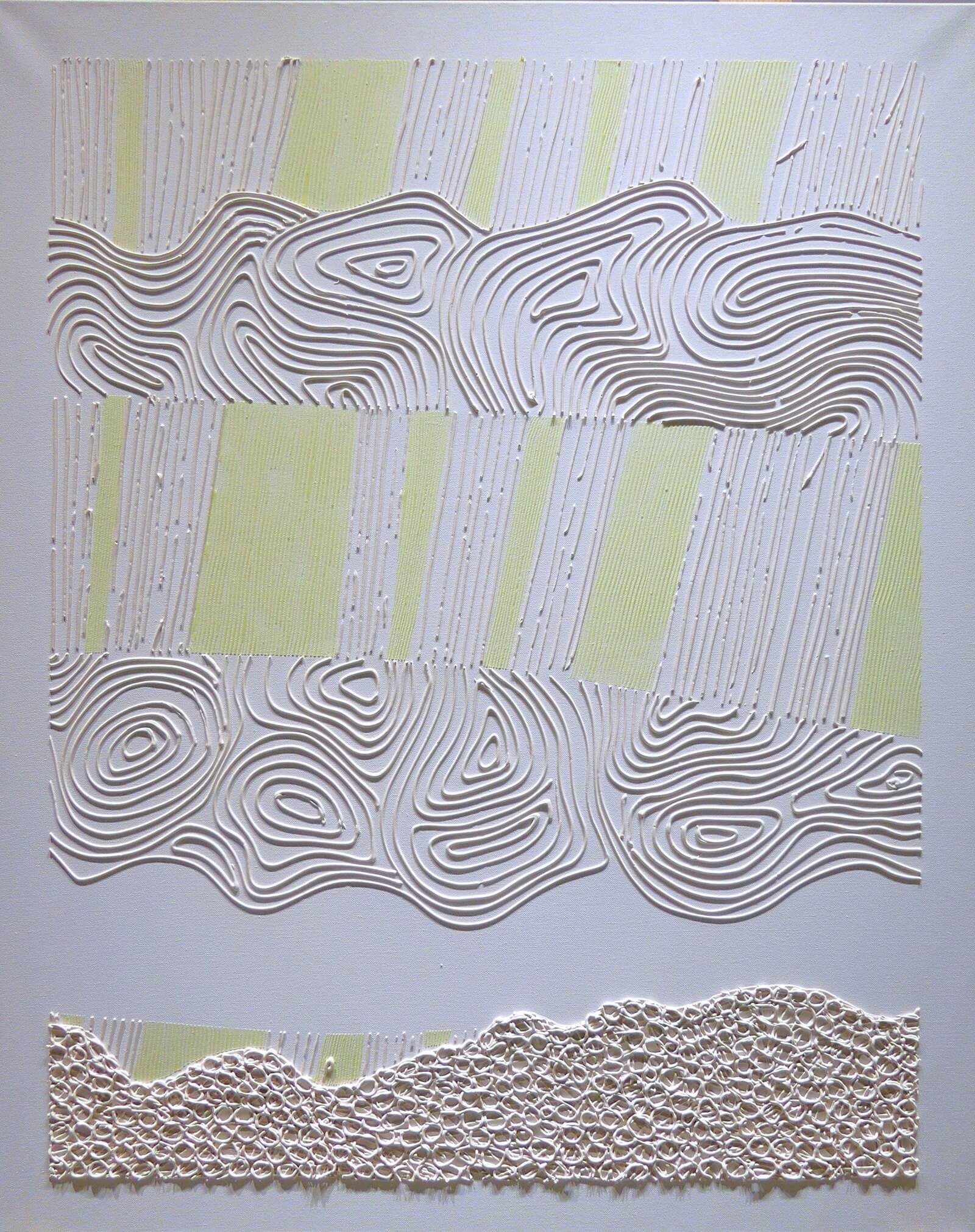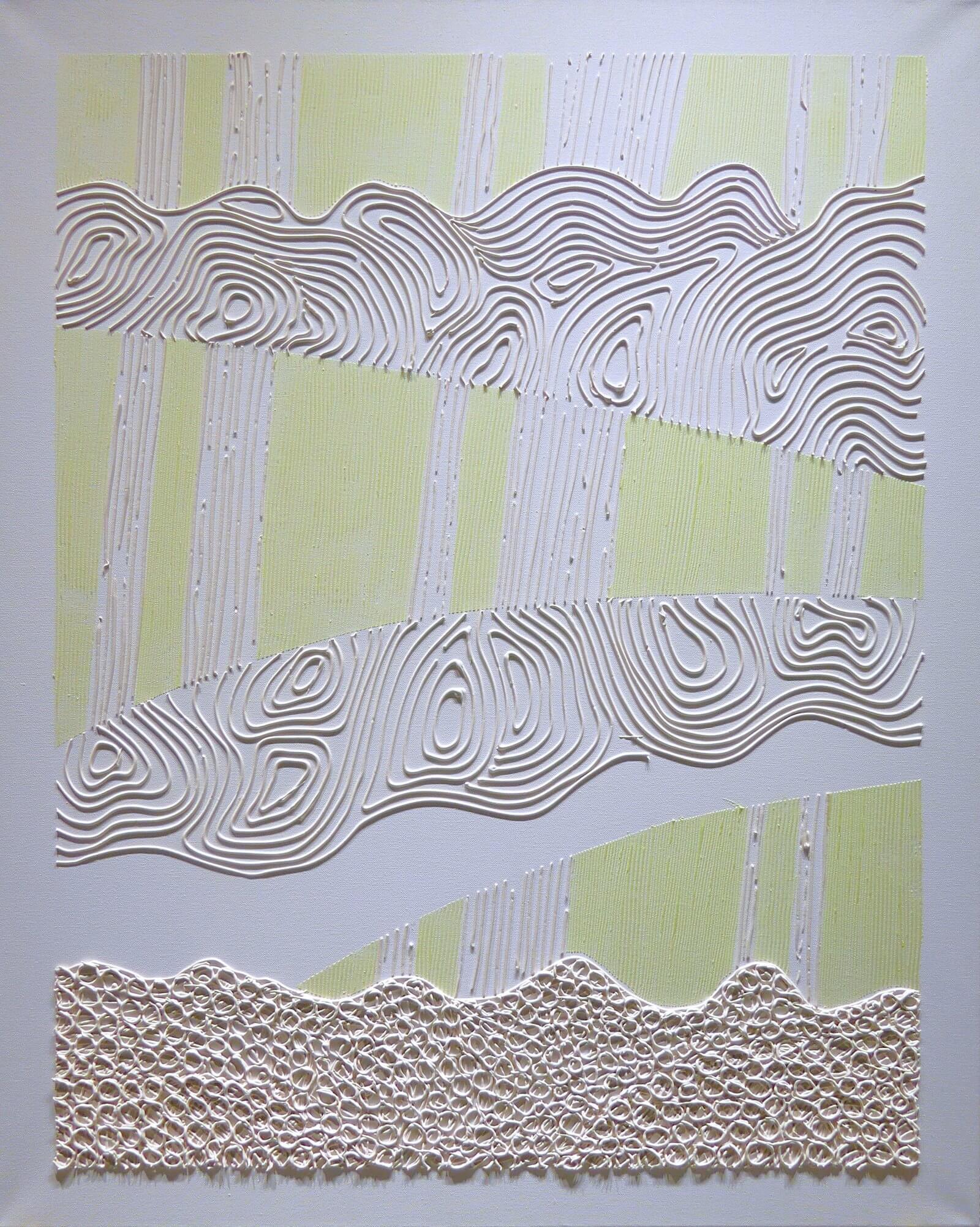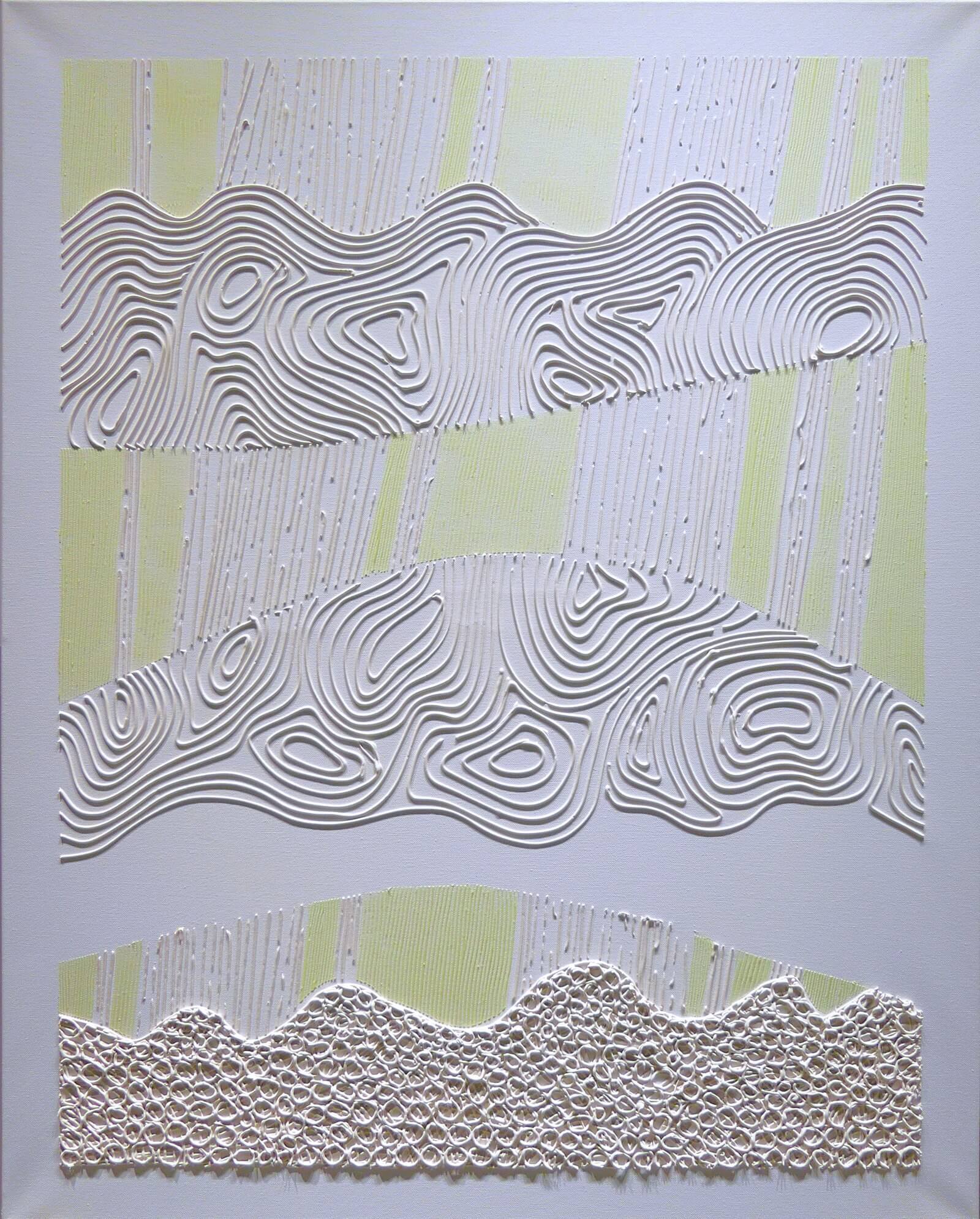 Obraz z białej serii "Zaangażowane wycofanie" inspirowanej szeroko pojętą kulturą i sztuką Japonii. Zastosowanie farby świecącej w ciemności umożliwia oglądanie prac zarówno w świetle dziennym, jak i w nocy, co stanowi dodatkowy, unikatowy wymiar tych obrazów.