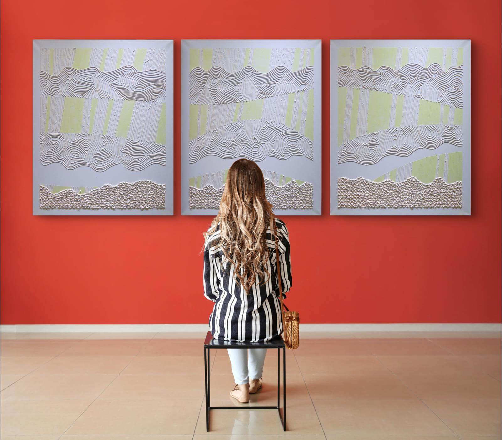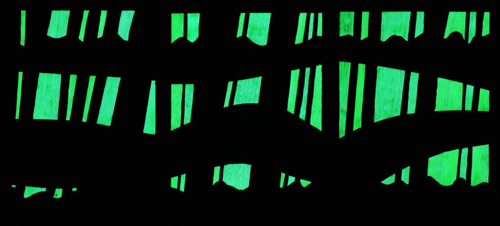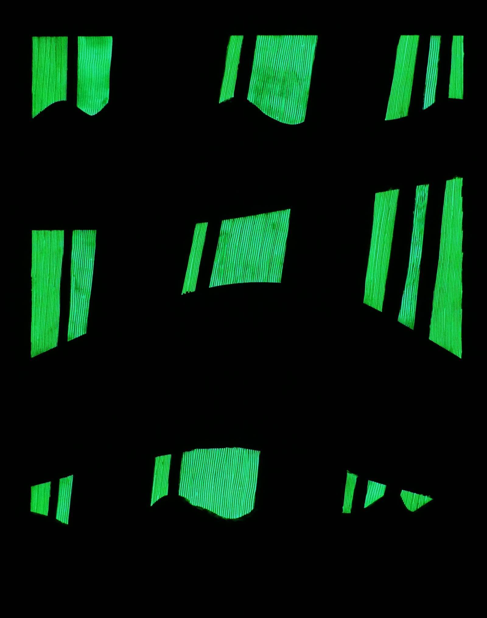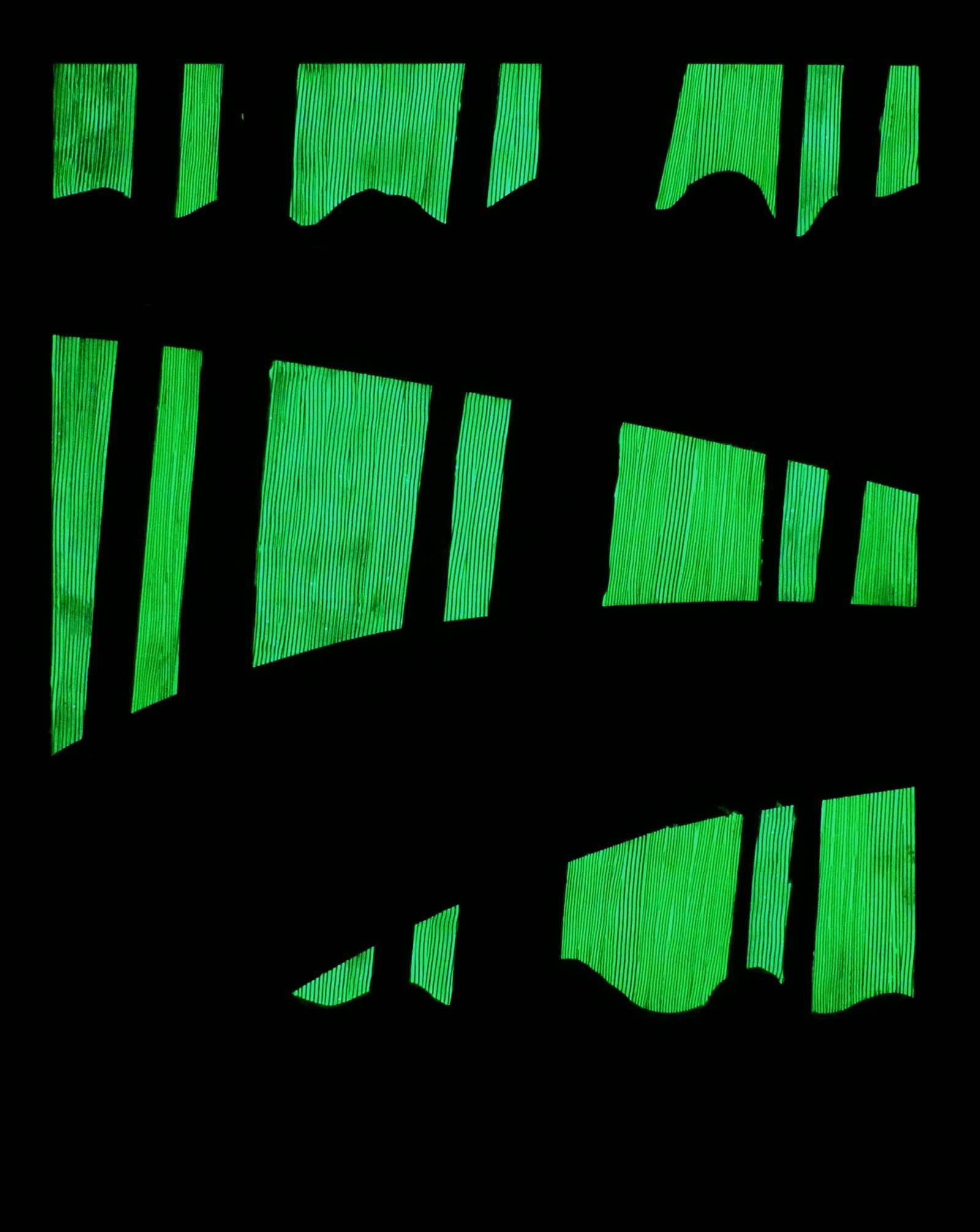 Obraz z białej serii "Zaangażowane wycofanie" inspirowanej szeroko pojętą kulturą i sztuką Japonii. Zastosowanie farby świecącej w ciemności umożliwia oglądanie prac zarówno w świetle dziennym, jak i w nocy, co stanowi dodatkowy, unikatowy wymiar tych obrazów.